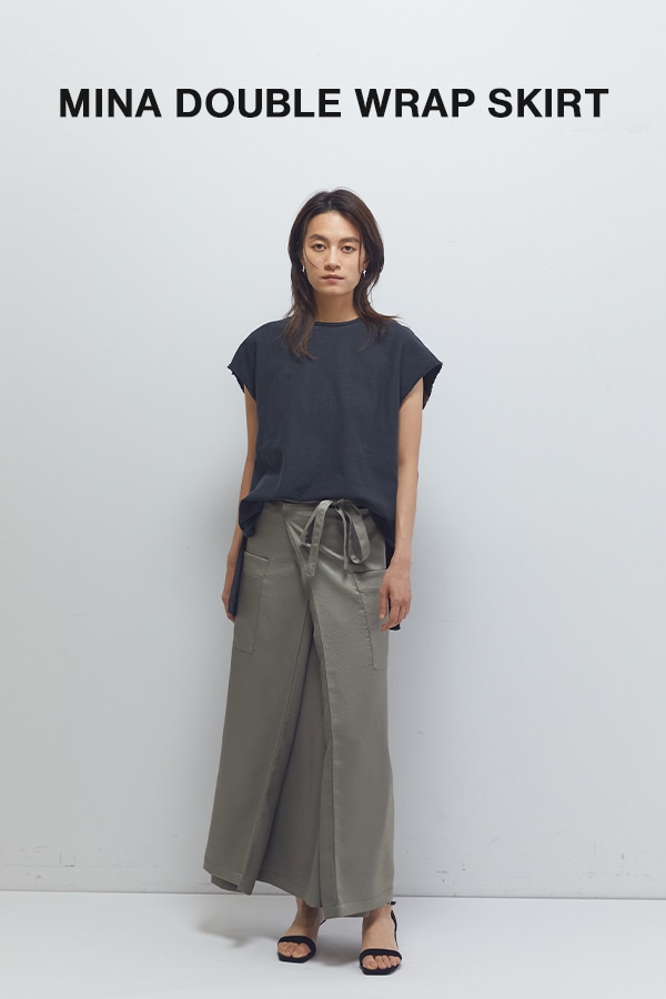 スカートを前後回転させてジョーゼット面を前でクロスすれば、歩く度にラップ部分から覗くサテンがデザインのポイントにも。