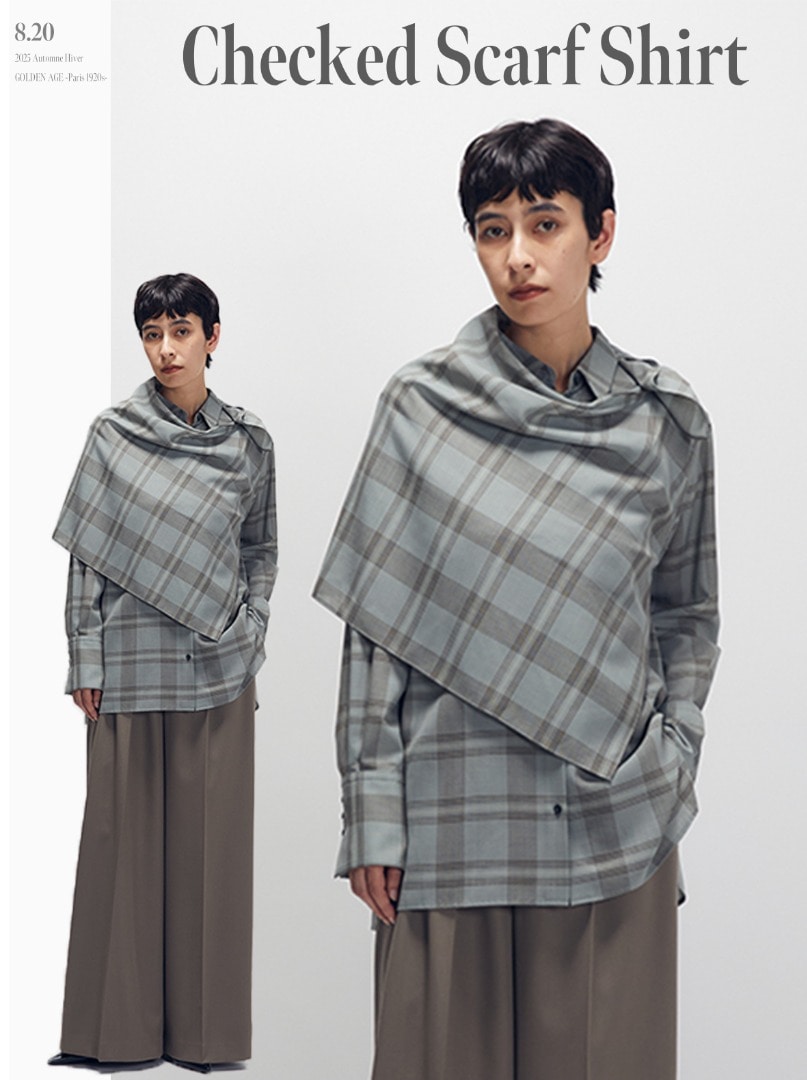 一枚で印象的なスタイルが完成する、スカーフデザインのチェックシャツ。