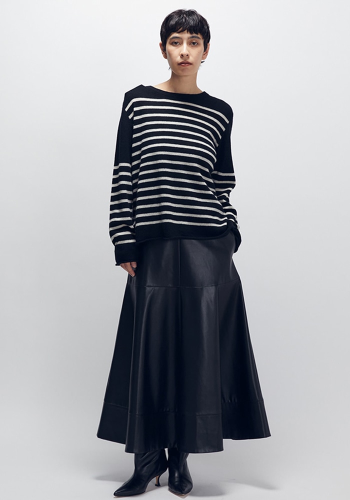 ボーダーニットにボリュームスカートを合わせてレディライクにスタイリングに。