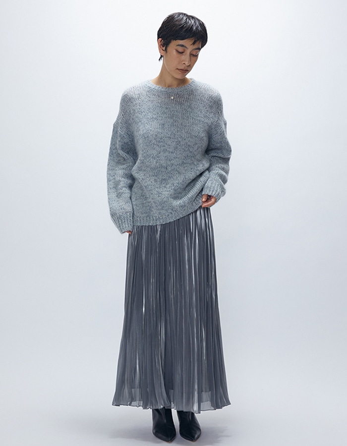 おすすめの着こなしは、シャイニーな光沢感が魅力のプリーツスカートとトーン合わせ。