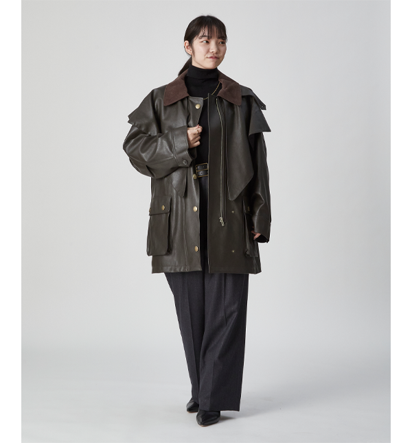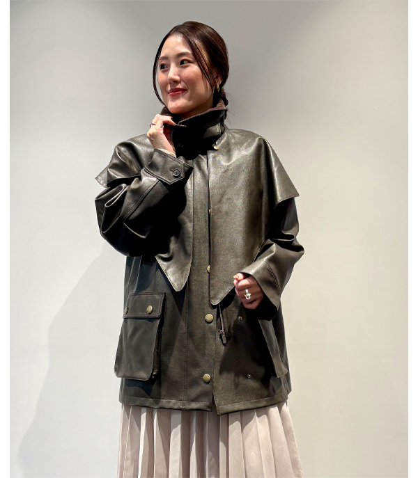 レザージャケットを合わせることでさらにシックな雰囲気に。