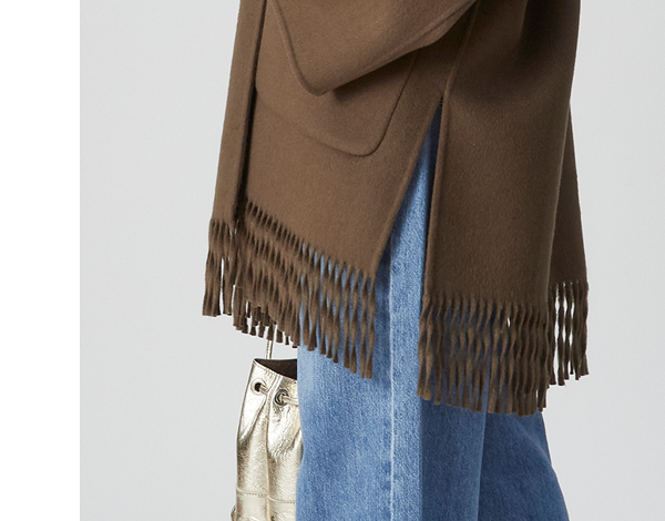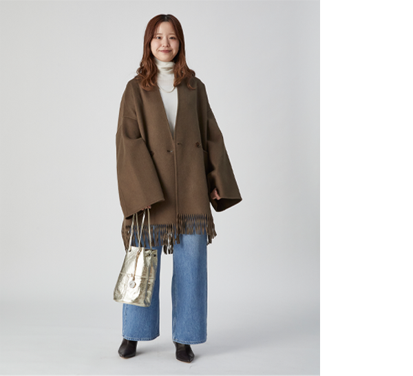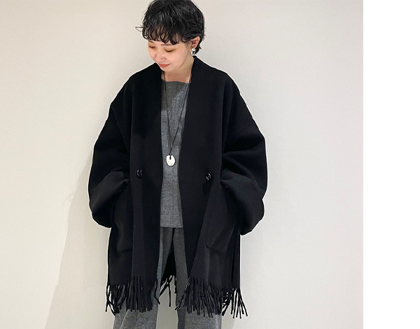 ストールを羽織っているようなシルエットで、歩く度に揺れるフリンジがポイントです。