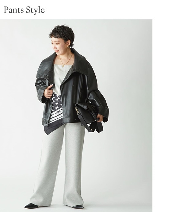 レザーパンツでハンサムに、デニムなどのカジュアルスタイリングでもサマになります。