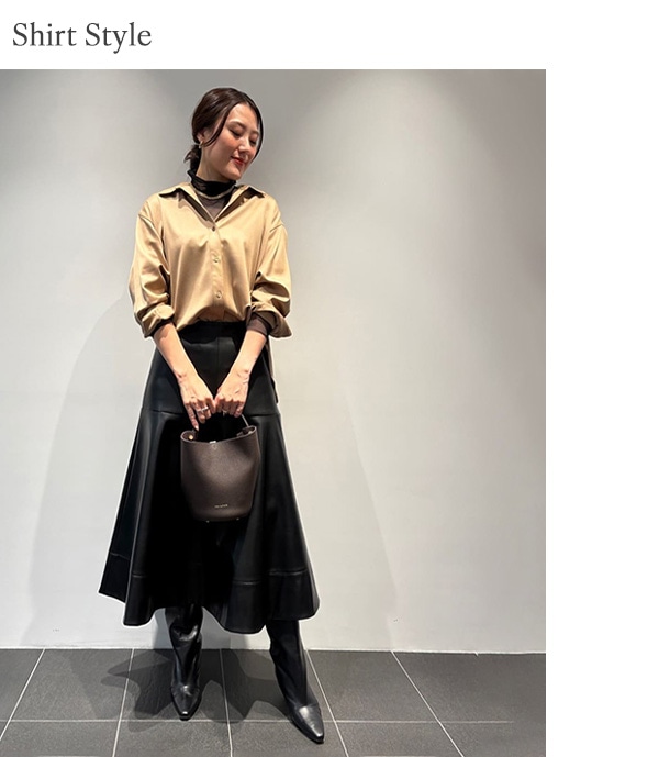 ウールサテンシャツの中にシアーハイネックカットソーをレイヤリング。
