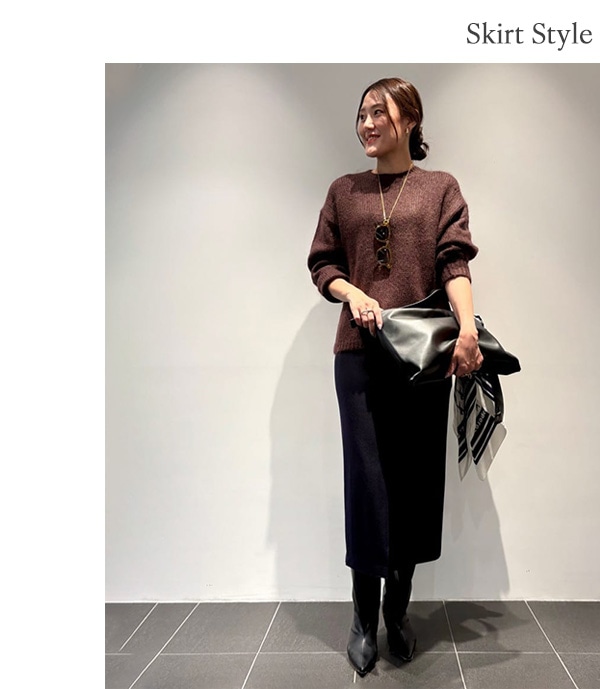 さりげなくラメが輝くニットと合わせて、女性らしい着こなしに。