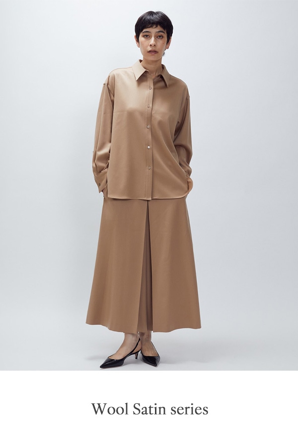 なめらかで光沢をたたえた、梳毛細番手のウールサテンを使用。