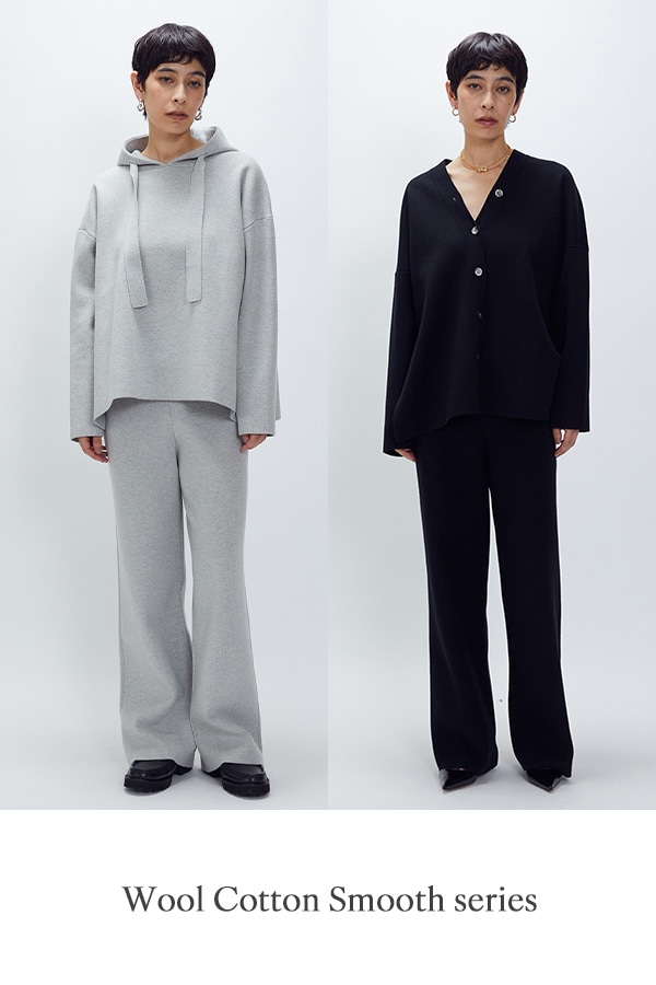 ウールコットンの梳毛糸をスムース編みに仕立てた、上品な見えが叶う素材。