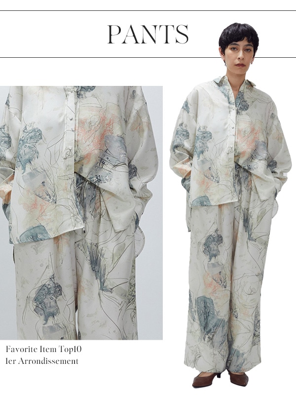優し気で柔らかな印象のプリントは、ニットとのコーディネートがよく合う。