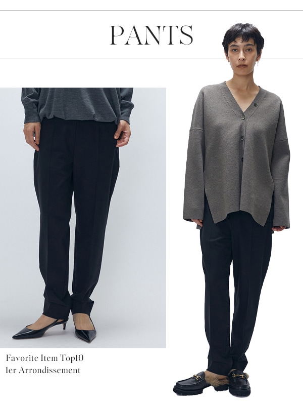 綺麗な表面感でオンオフ着用がしやすい細身のスティックパンツ。
