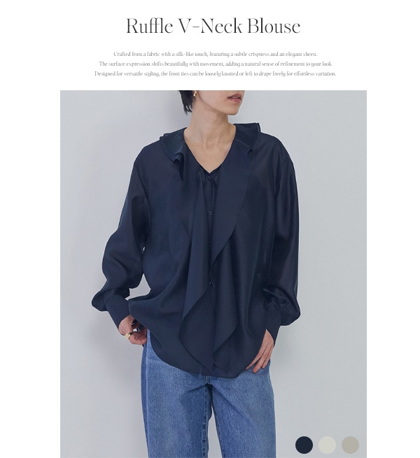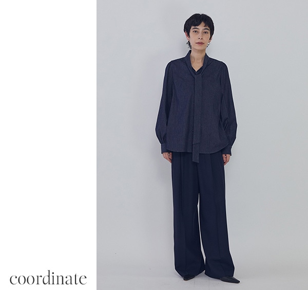 ラッフルボウタイが印象的で、一枚で着映えするブラウス。