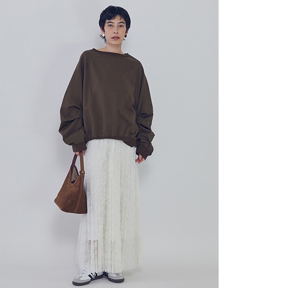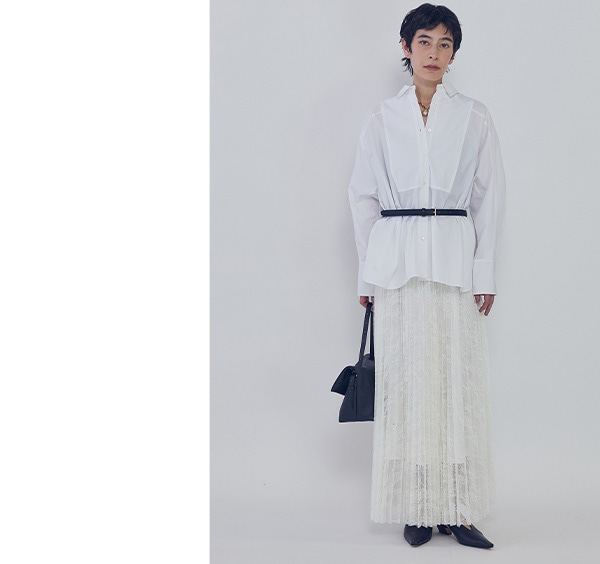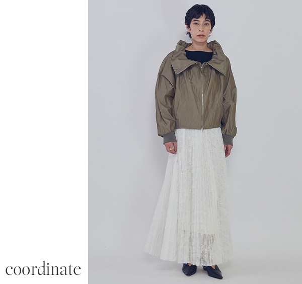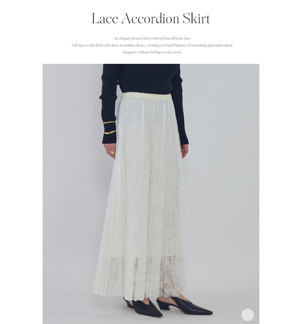 やわらかなレースにすっきりとしたアコーディオンプリーツをかけることで、