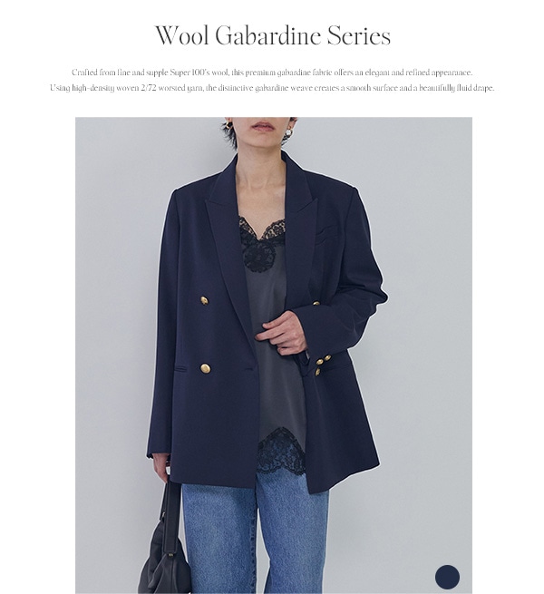 Super100’s(ウール梳毛2/72)の細番手糸を高密度に織り上げた、国内・尾州産の上質ギャバジン素材。