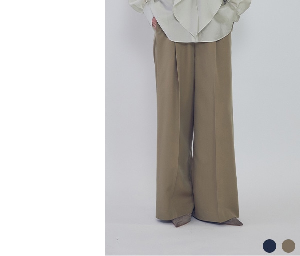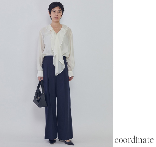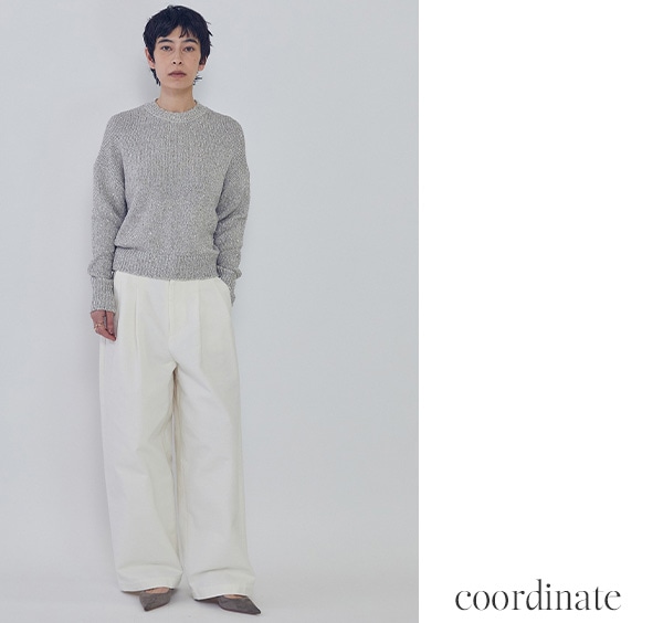 この素材ならではの仕立てで、2タックのボリュームあるシルエットも広がりすぎず、すっきりとした印象に。