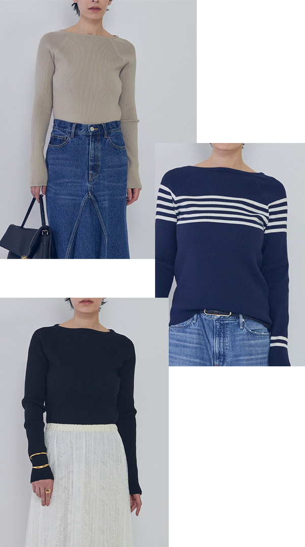 小さめのボートネックが、上品で繊細な印象を演出します。