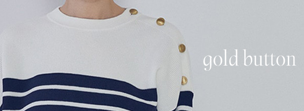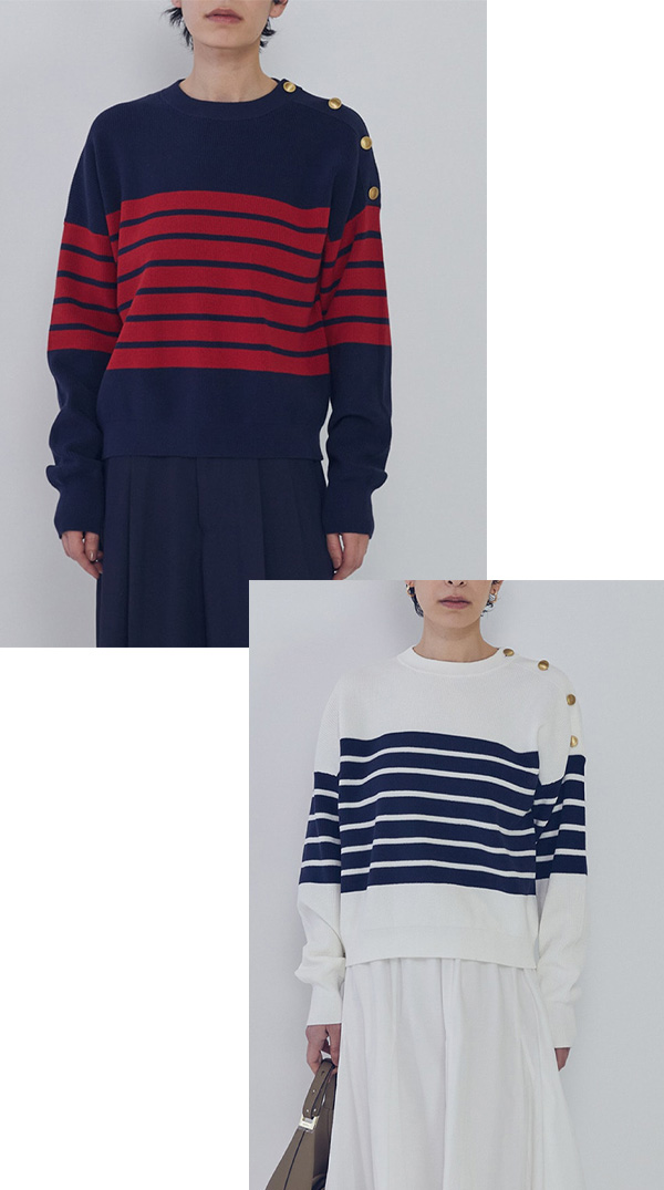 マリンムード漂う、金ボタン付きボーダーニット。