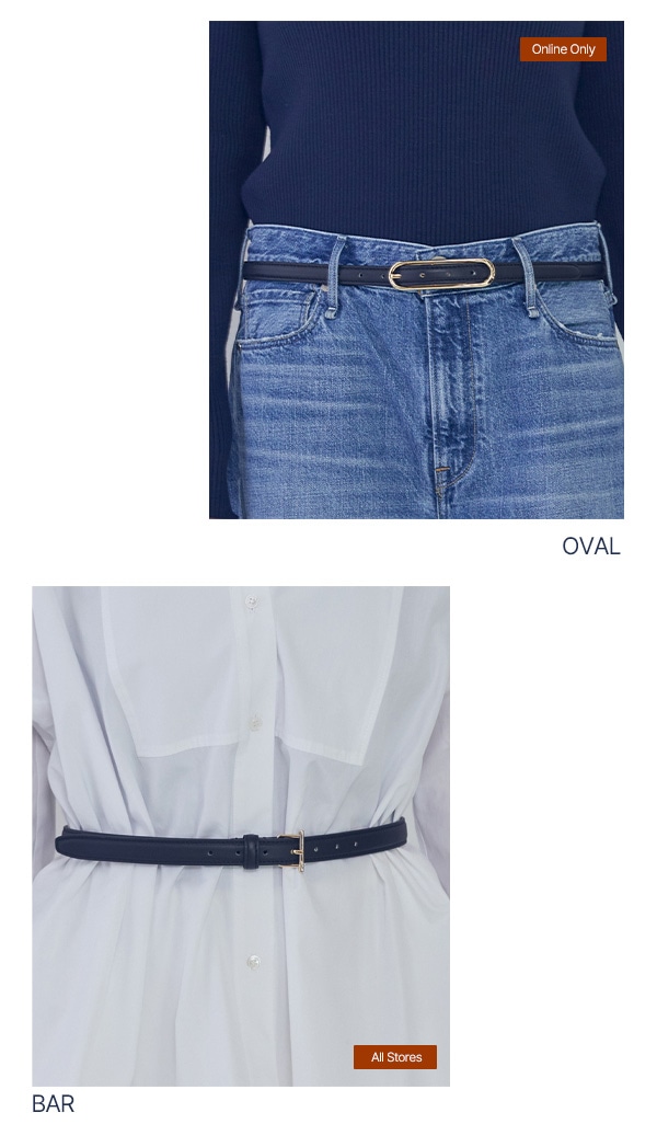 BAR BELTは、小さな金具ながらもスマートな外観が魅力的。シャツの上から巻いたアレンジも、小技が効いておしゃれです。