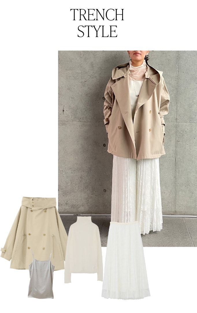 トレンチスタイルも、シアーハイネックを重ねることで軽やかな印象に。