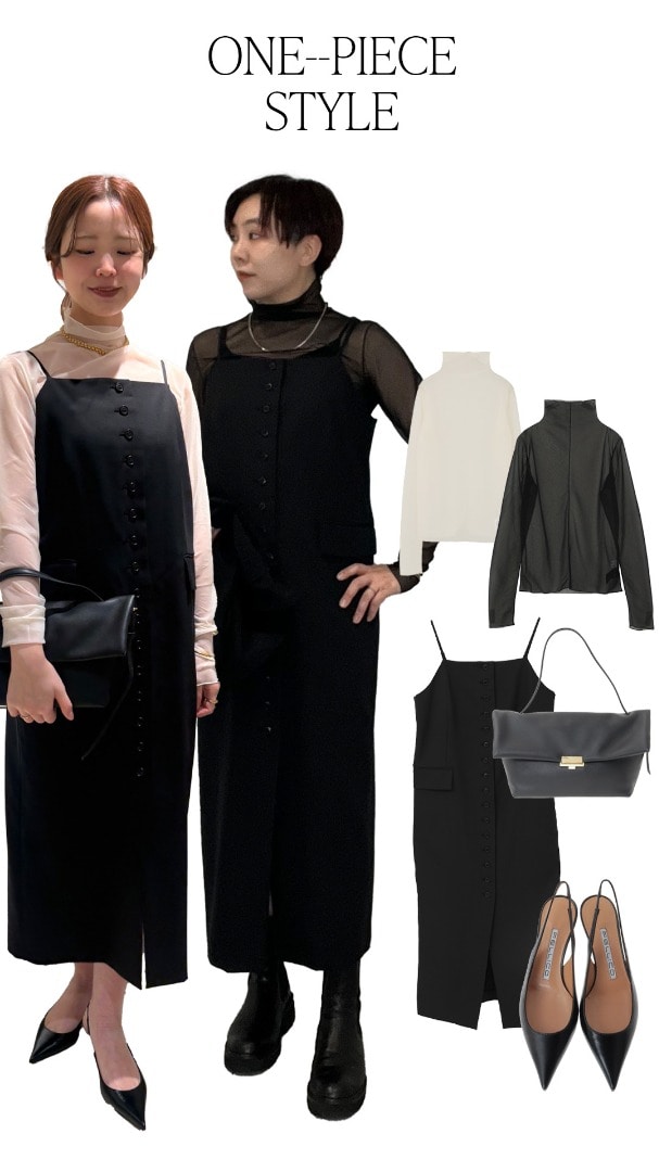 ブラックのワンピースに透け感のある素材を重ねることで、