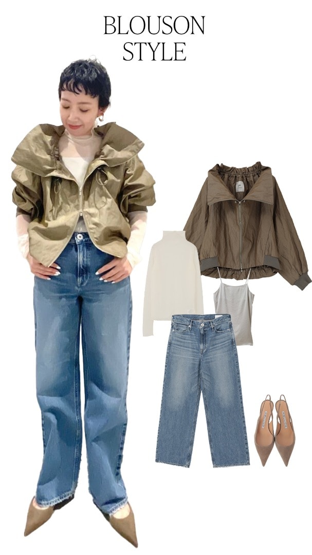 カジュアルなブルゾンスタイルに軽やかさと女性らしさをプラスしたコーディネート。