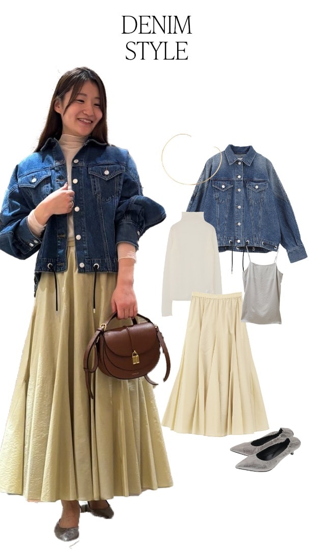 デニムの程よいカジュアルさとフェミニンさがバランスよく調和。