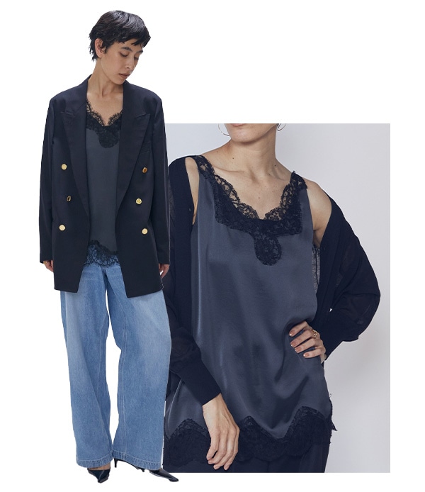 襟元からレースをちらりと覗かせるだけで、スタイリングにレディなニュアンスをプラス。