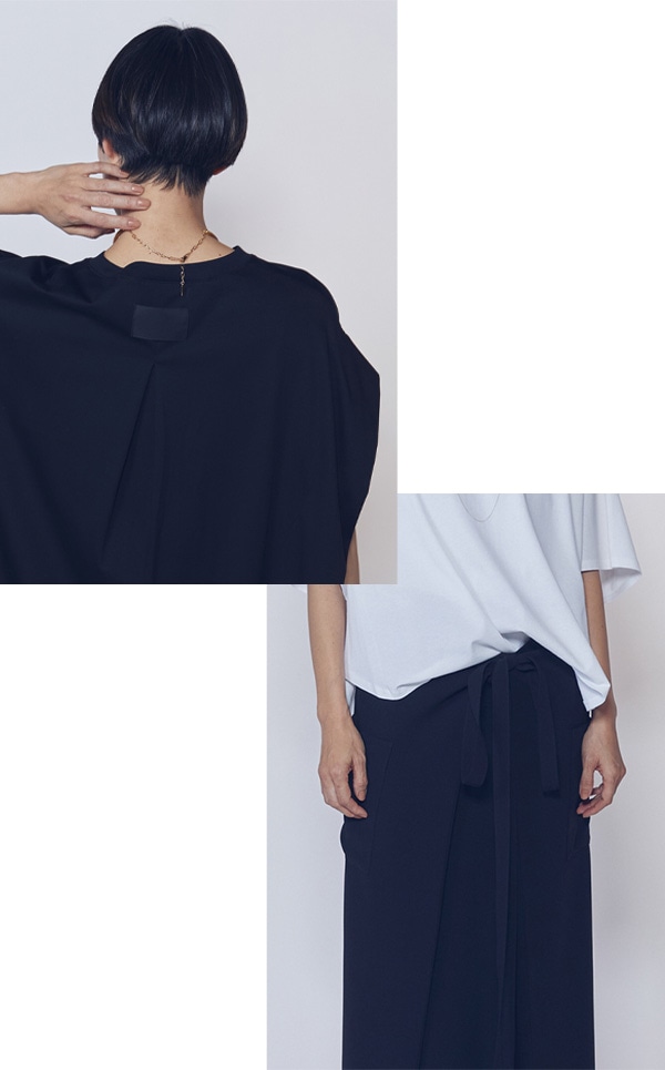 布帛のような構築的な発想をニットに取り入れ、ディテールとシルエットで魅せるのが特徴です。