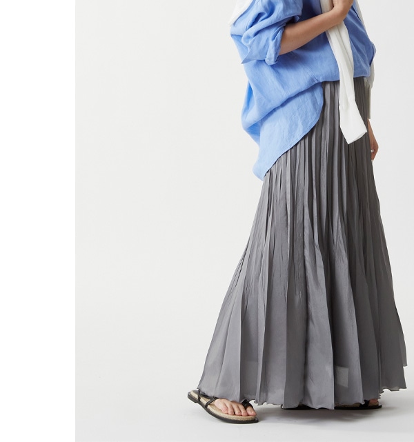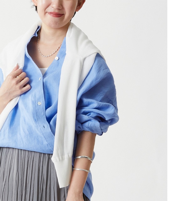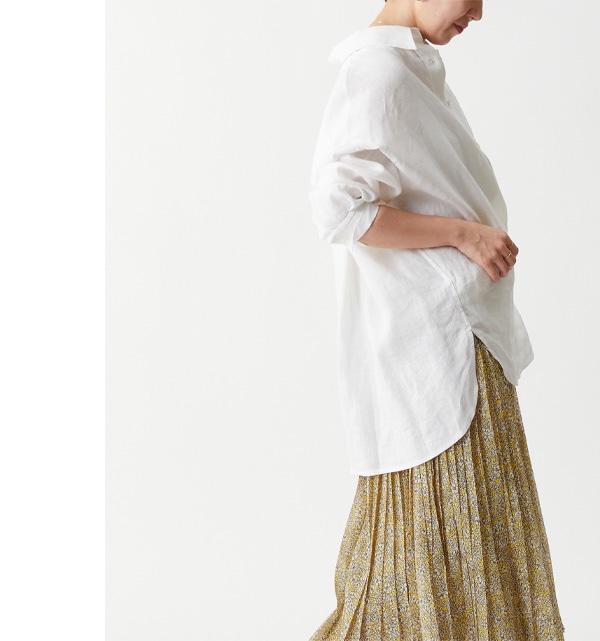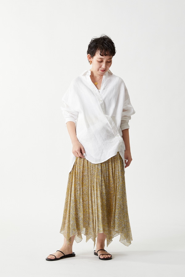 リネンのざっくりとした風合いが、甘めのスカートを中和させるような役割に。