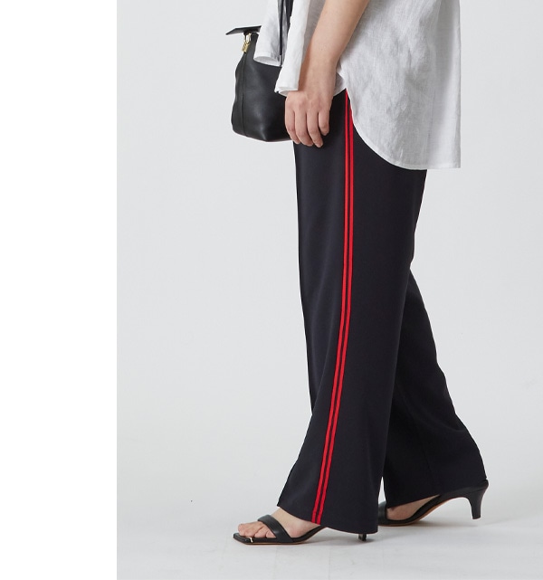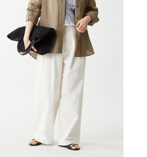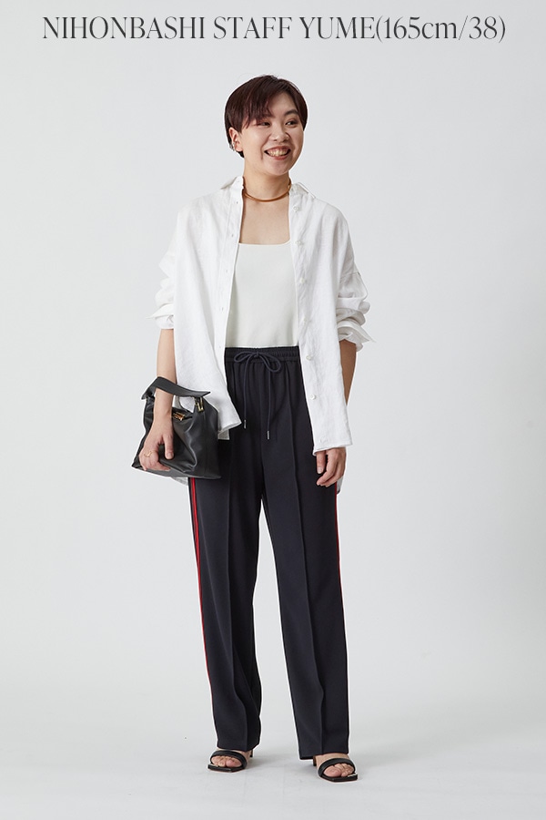 ジャージー素材で履きやすく、すっきりシルエットも叶うパンツにリネンのブラウスを。