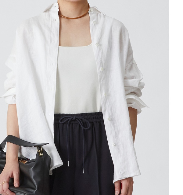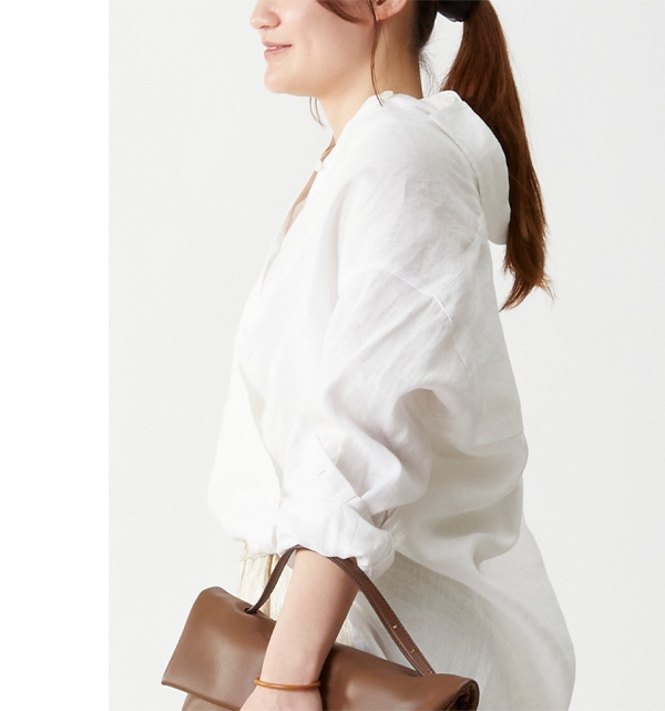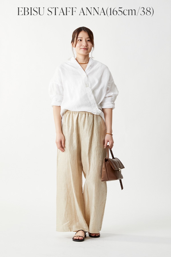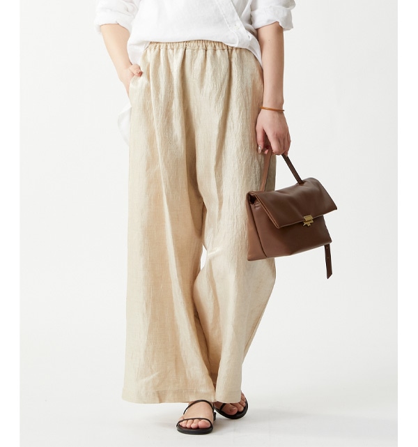 白のリネンシャツに、光沢感のあるリネンパンツを合わせたスタイリング。