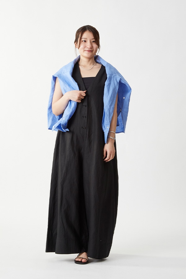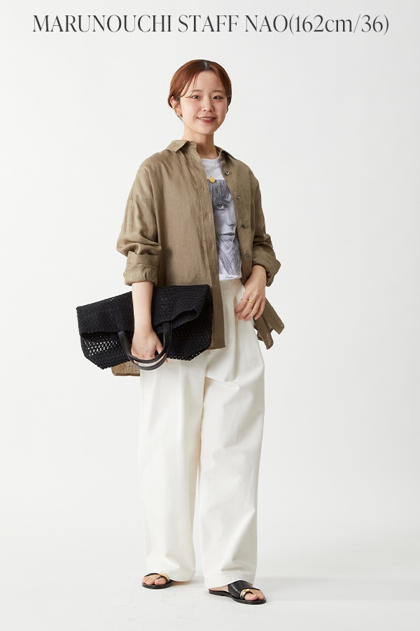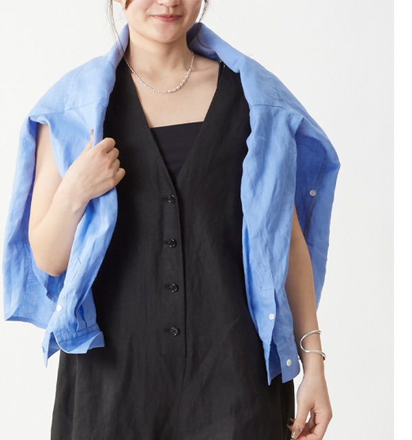 衿を抜いて着用していますが、リネンシャツはお尻まですっぽりと隠れるのも嬉しいポイント。