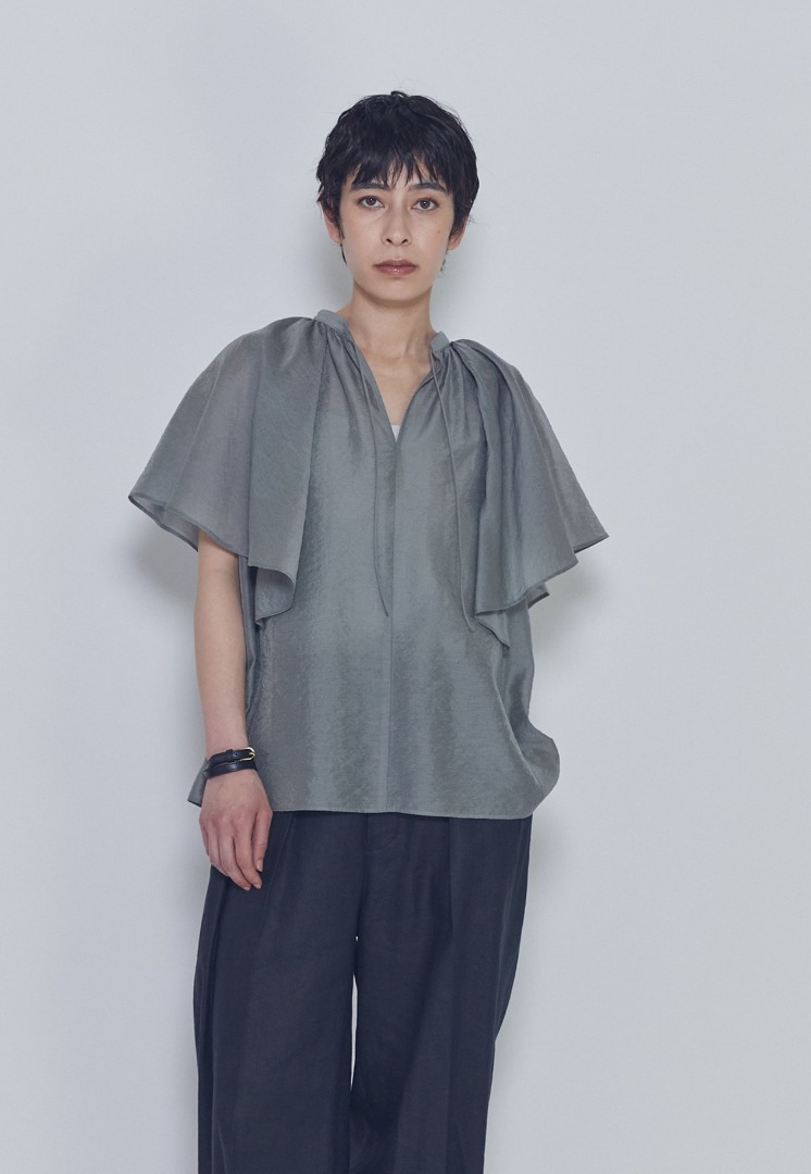 首元のギャザーと袖にたっぷりとフレアを施し、動きのある華やかなデザインに。