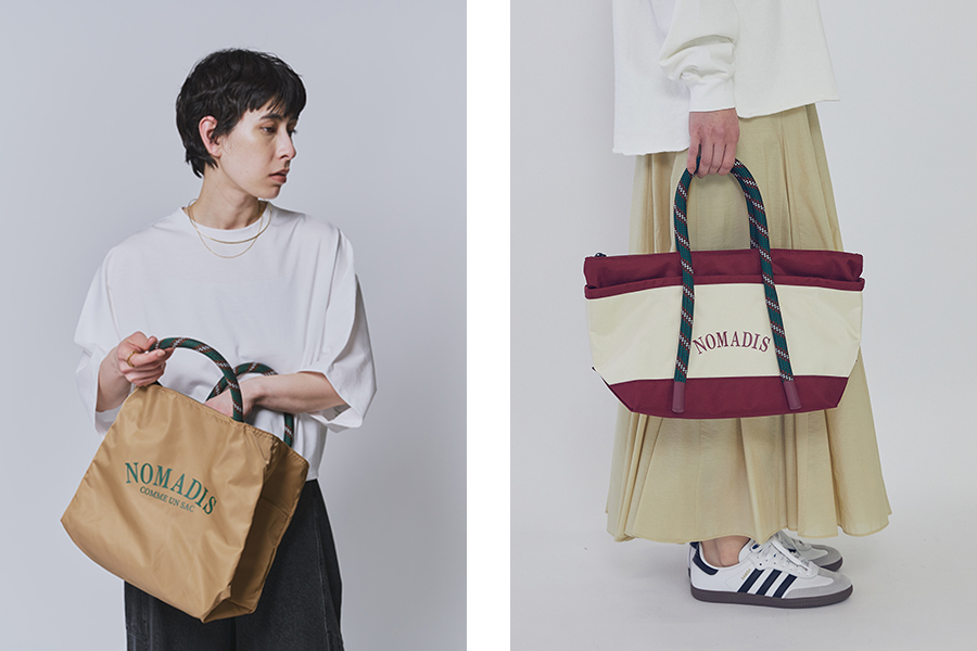 ノマディスからは定番のトートバッグと、⾃由でアクティブなライフスタイルをイメージしたトートバッグの2型。