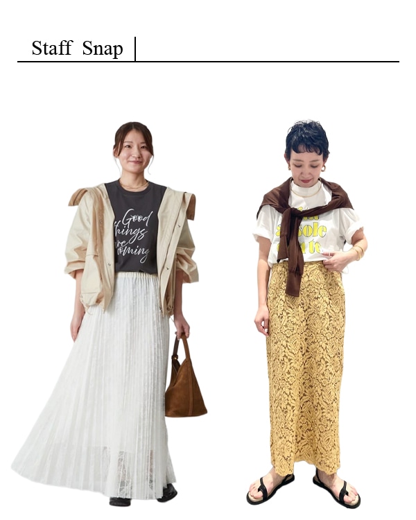 あえてフェミニンなスカートとロゴTシャツを合わせて、甘さをほどよく引き算した、抜け感のあるバランスに。