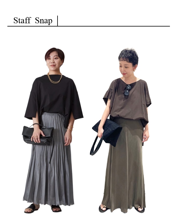 ミニマルな無地のTシャツトップスに、揺れ感のあるスカートを合わせて、やわらかな動きをプラス。