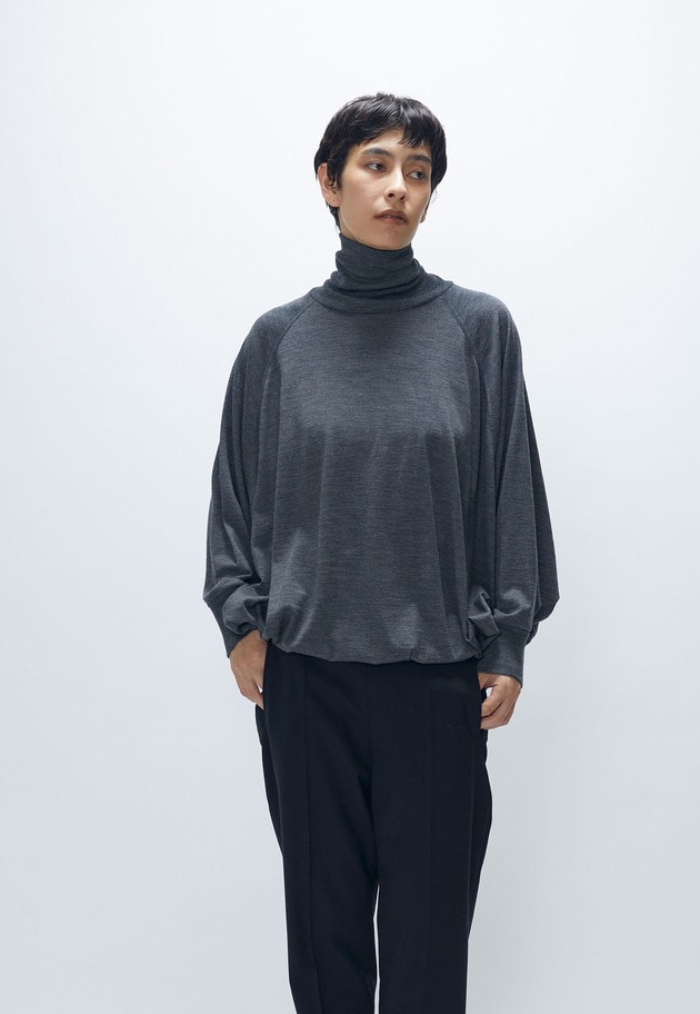 ニットの裾には柔らかいリブが入っているので、お好みの雰囲気でブラウジングが可能です。タートル部分も柔らかい生地なのでチクチク感なくリラックスして着ていただけます。
