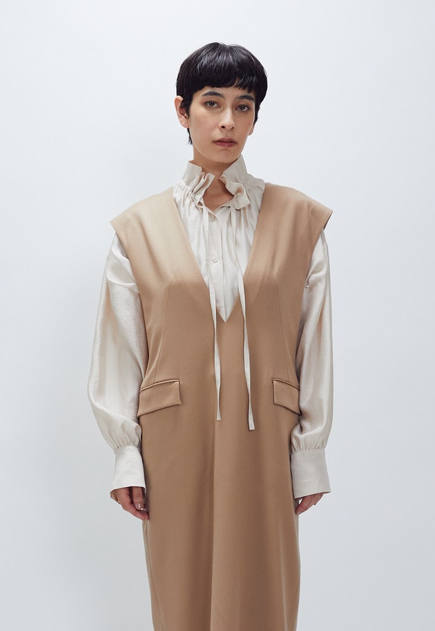 ニュアンスブラウスは襟元のギャザーを調節することで表情を変えることができ、オンオフ共にコーディネートしやすいアイテムです。