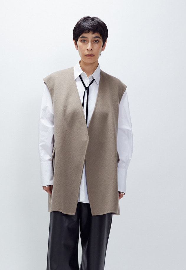 甘めが苦手な私ですが、ダブルビーバージレとフェイクレザーパンツを合わせるとちょうど良いバランスになりました。