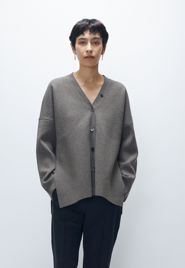 ネックラインが綺麗なニットカーディガンとサテンスカートを合わせました。