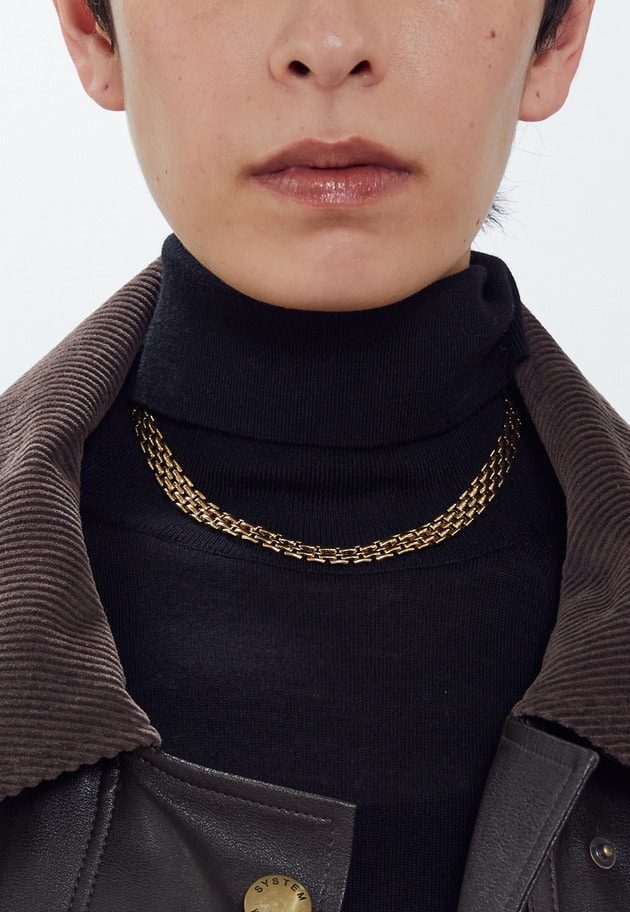 ウールサテンシャツの中にシアーハイネックカットソーをレイヤリングしています。