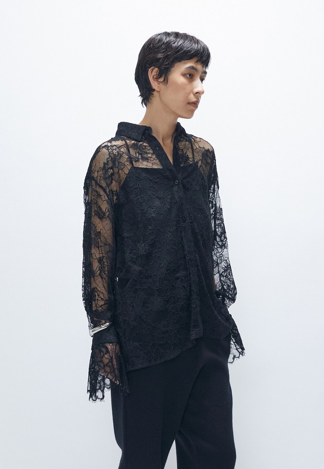 今回は綺麗めに、レースブラウスをちらっと見せて今年らしいスタイリングにしました。