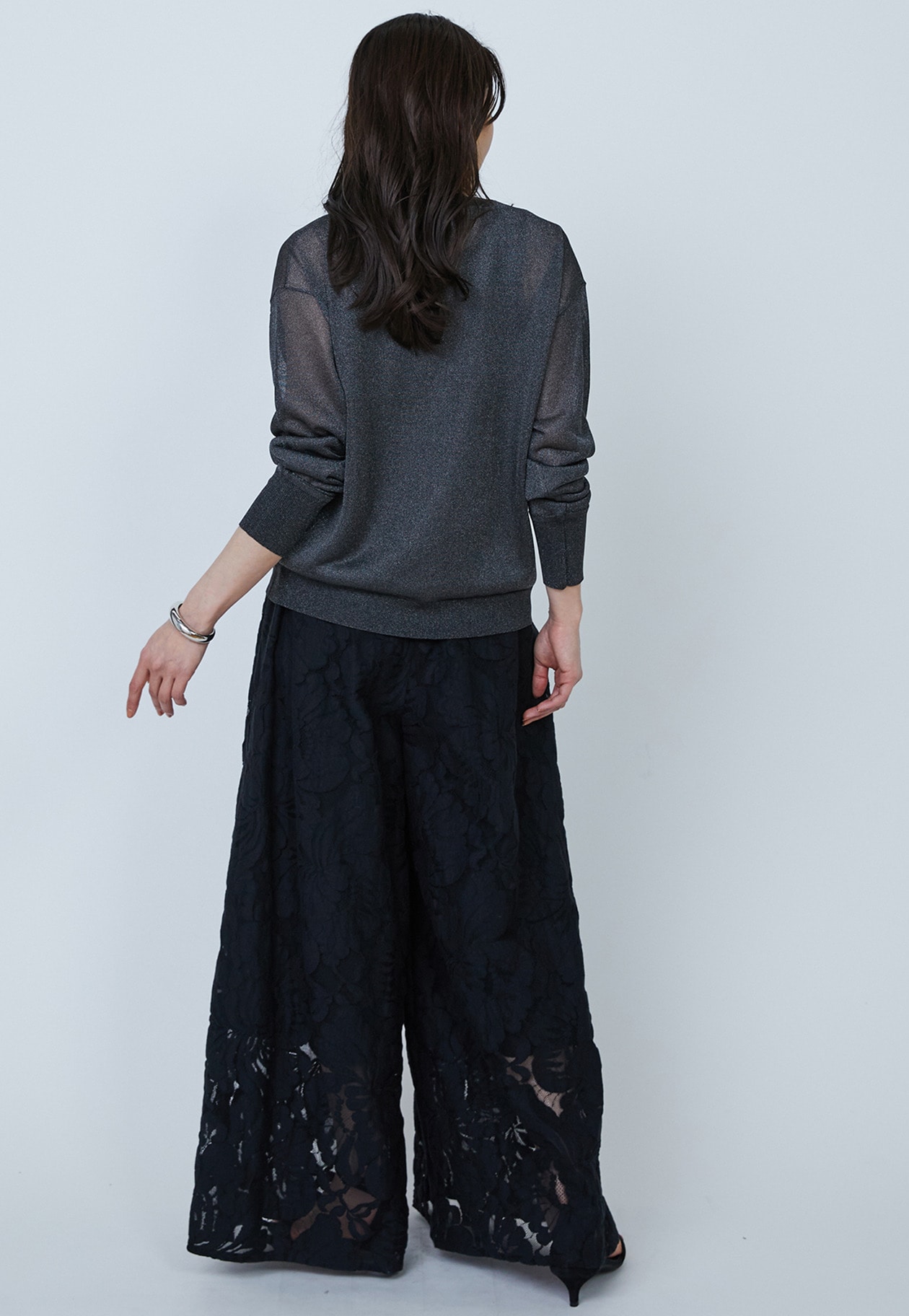 つややかな表面感に、透け感も控え目なのでオンオフどちらでも着用できるアイテムに。