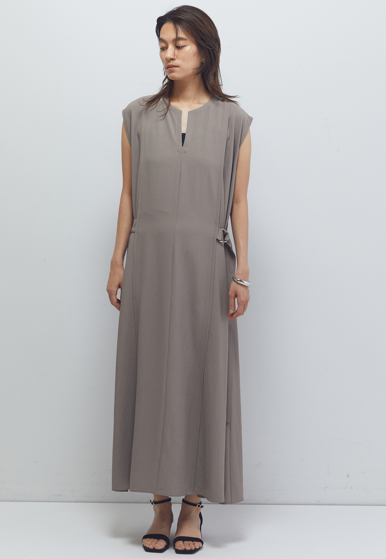 ストンと綺麗に落ちる生地をたっぷり入れることにより、身体のラインを拾わず上品なAラインシルエットになりました。