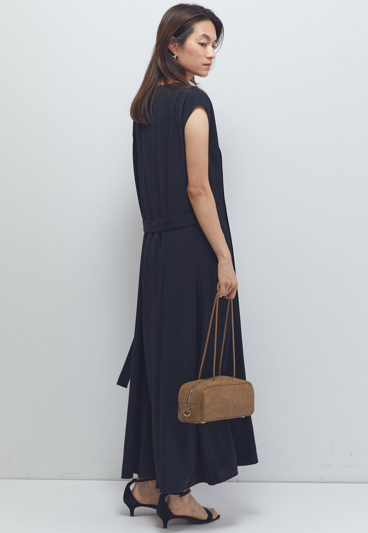 ベルトは閉めて頂いてウエストマークと、緩めて頂きAラインの2パターンのシルエットをお楽しみいただけます。