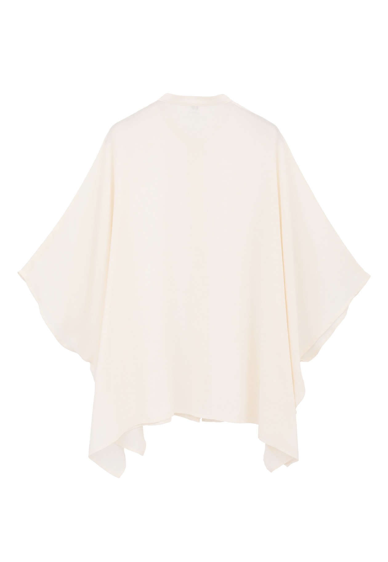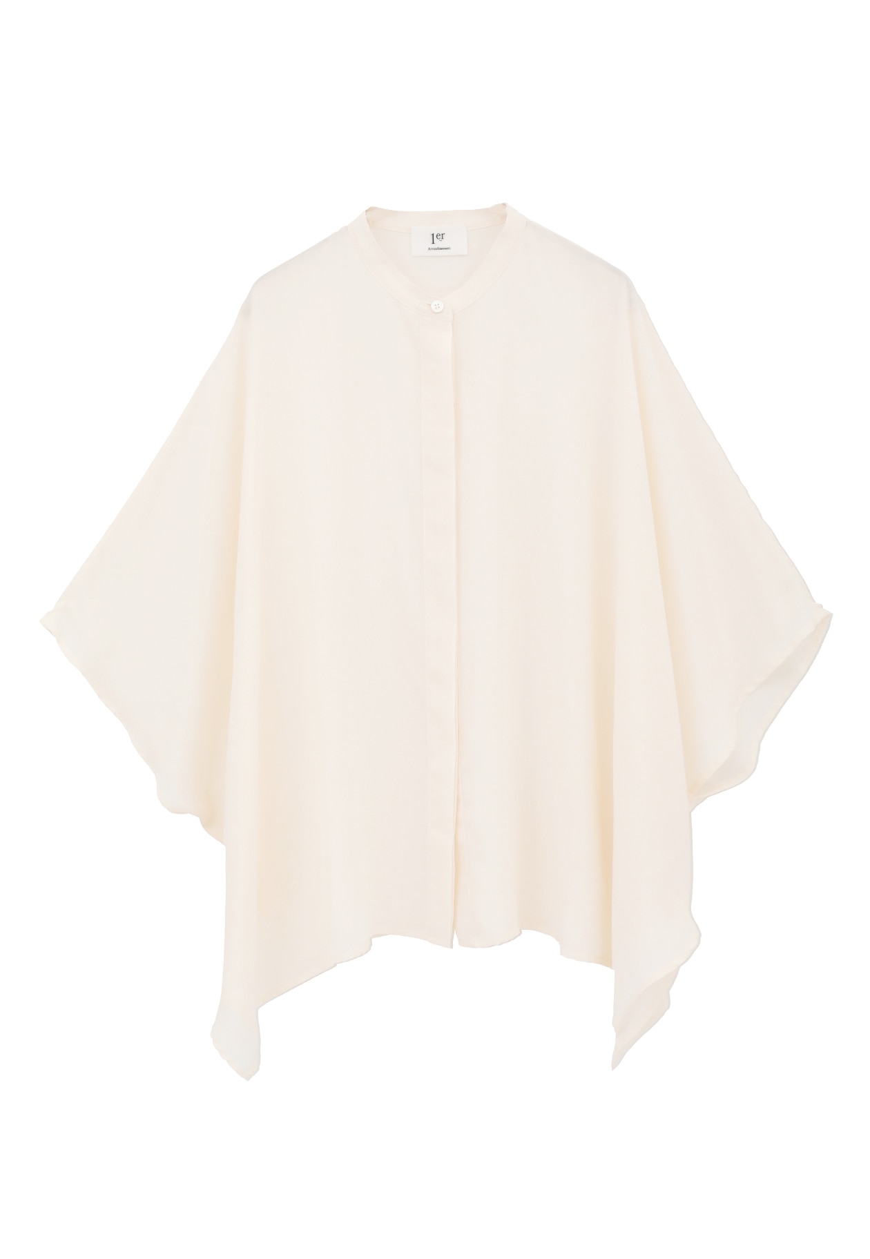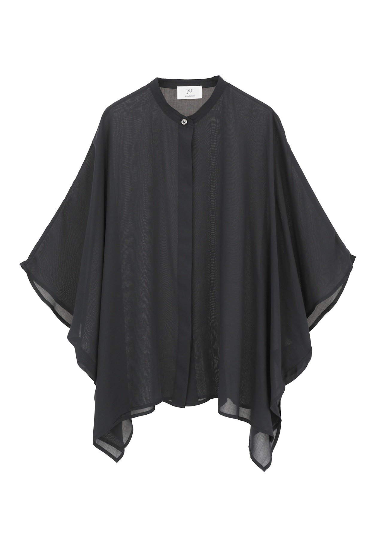 ポリエステル100%のシアー素材を使用した、バンドカラーのマントブラウス。