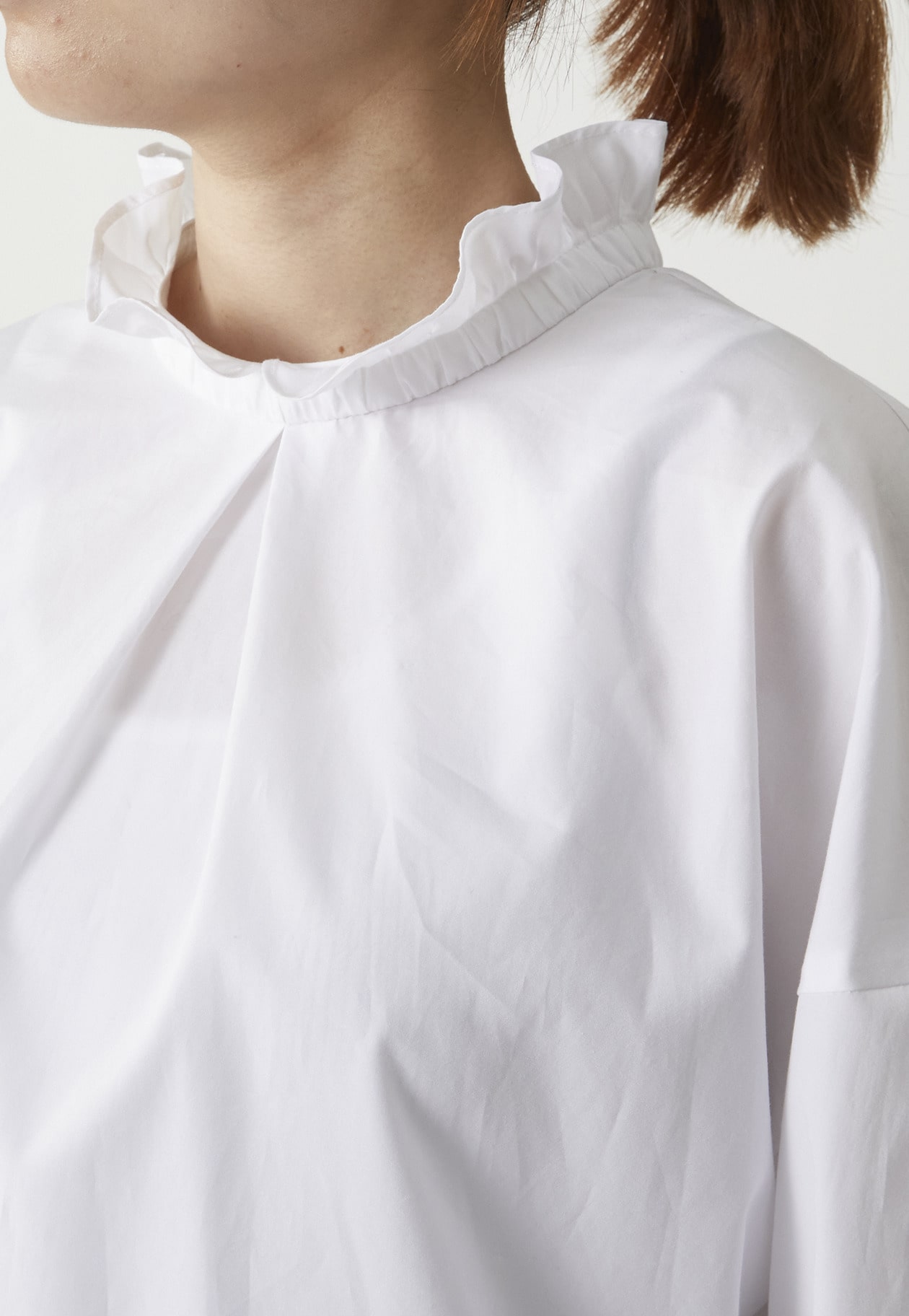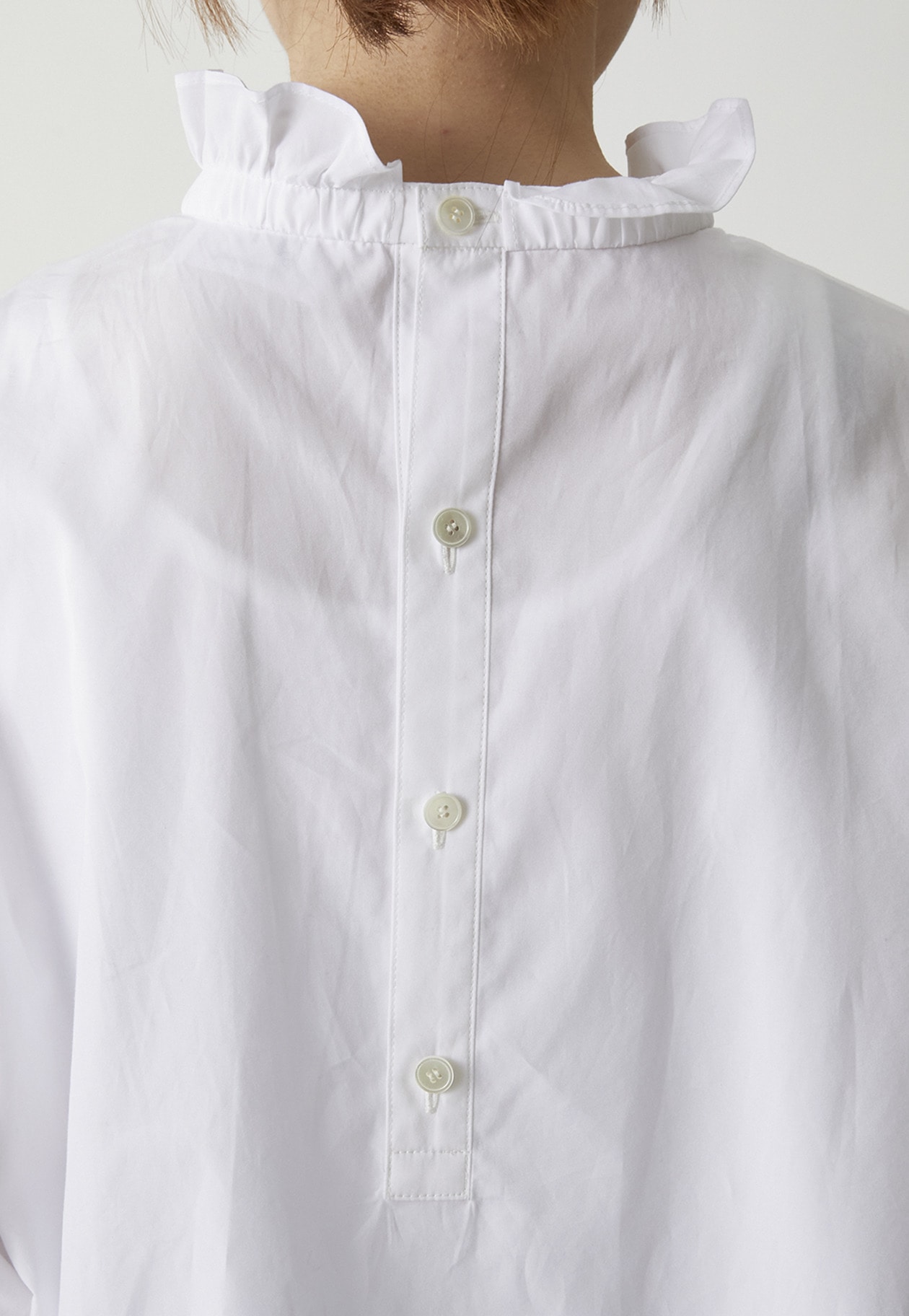 スタンドカラーに控えめなラッフルを配したブラウスは、高密度コットンのシャツ地を用いて端正な顔立ちに!