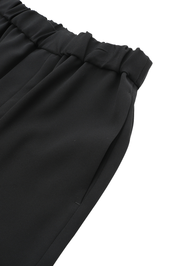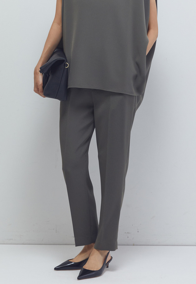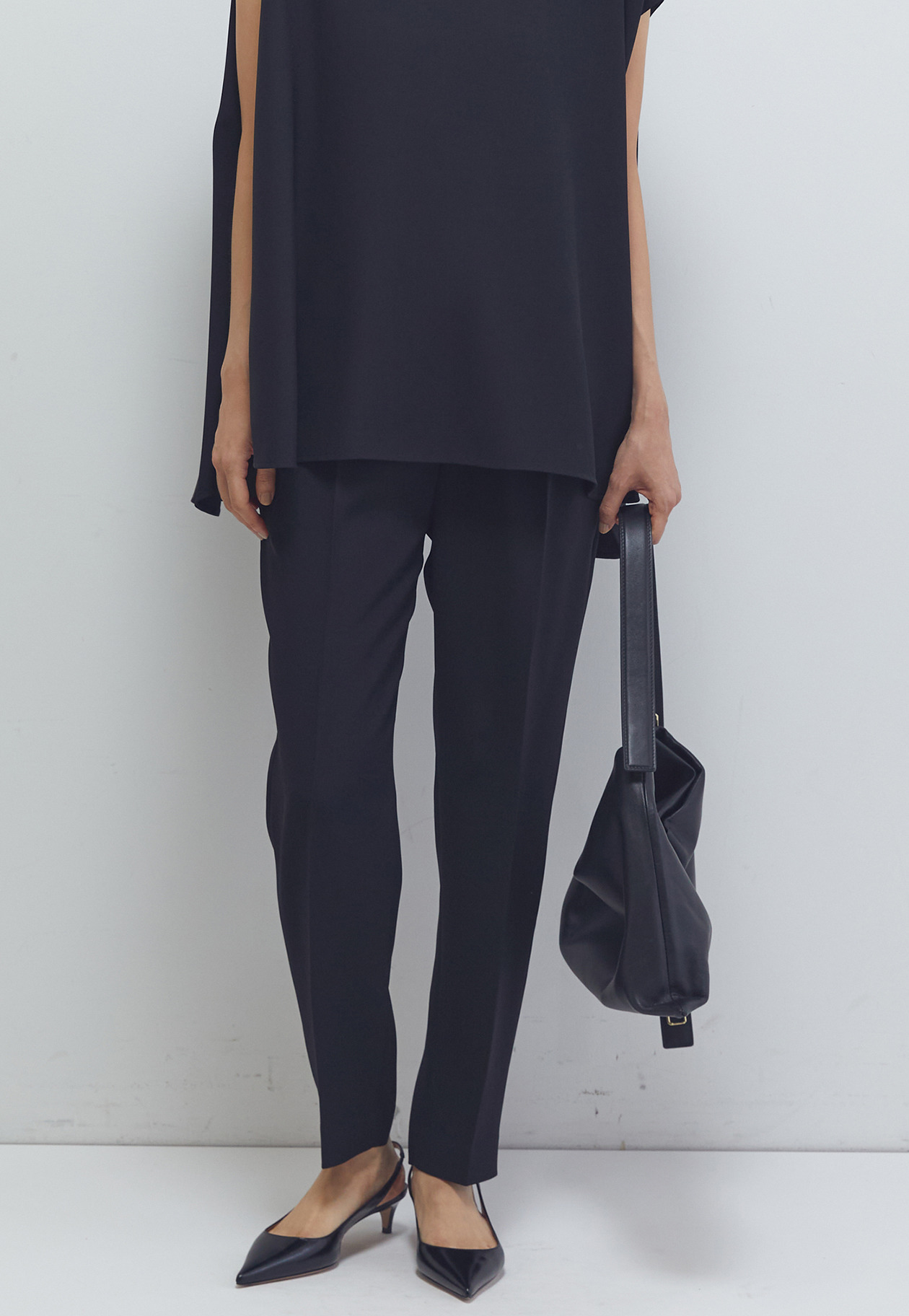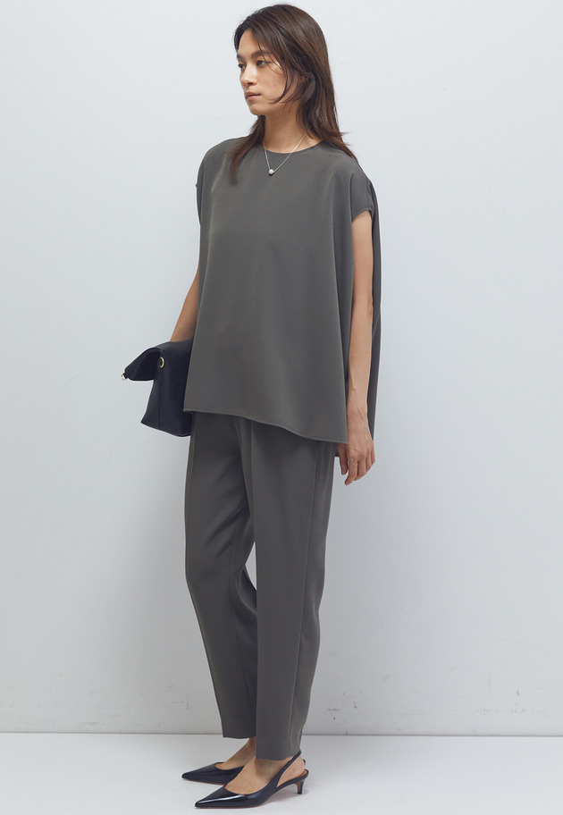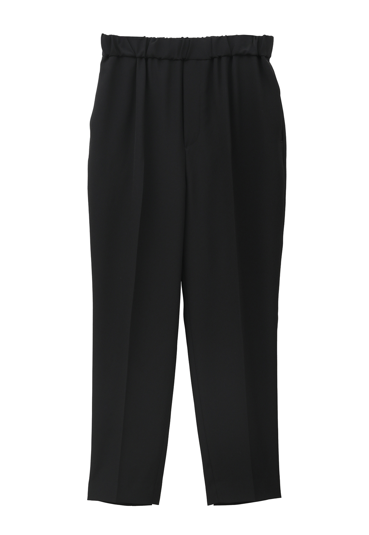 すっきり見えるテーパードシルエットのジョーゼットパンツ。