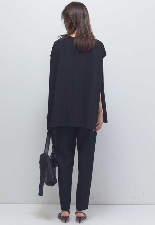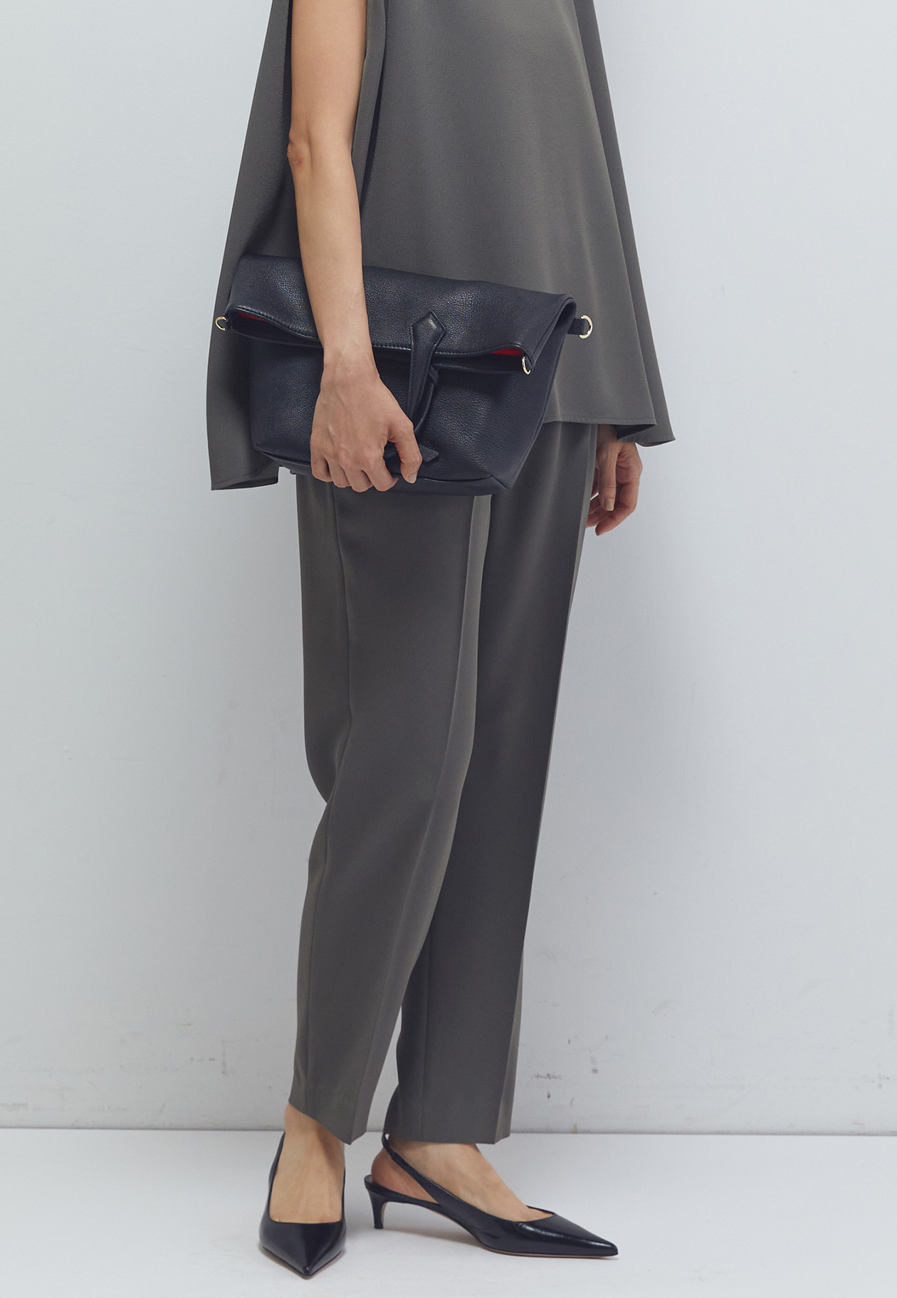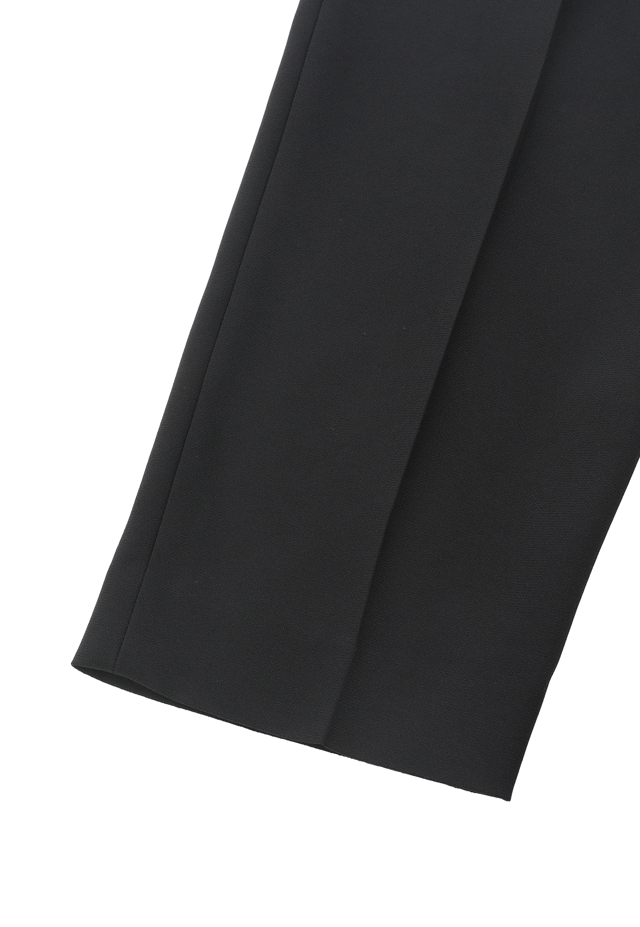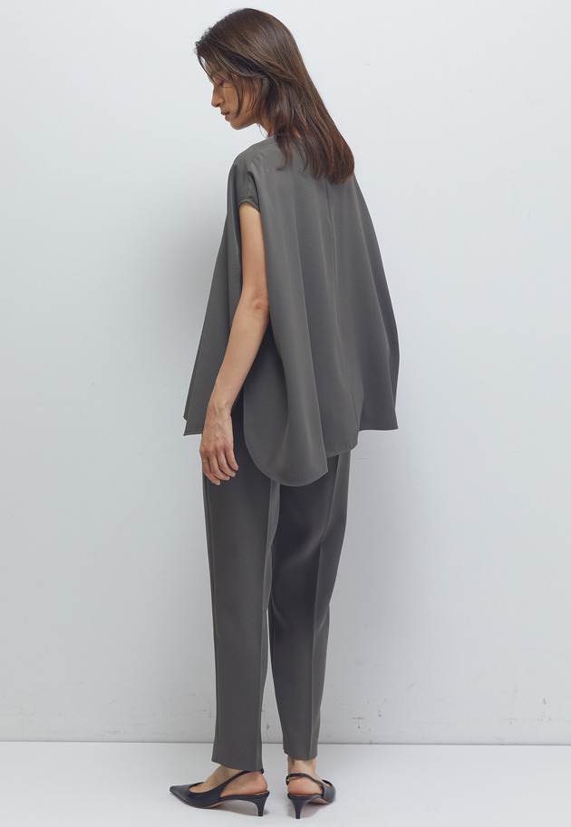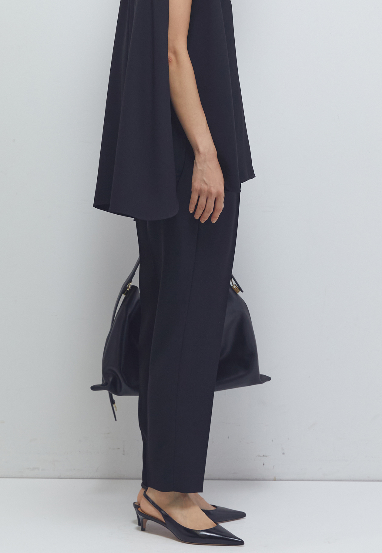 すっきり見えるテーパードシルエットのジョーゼットパンツ。