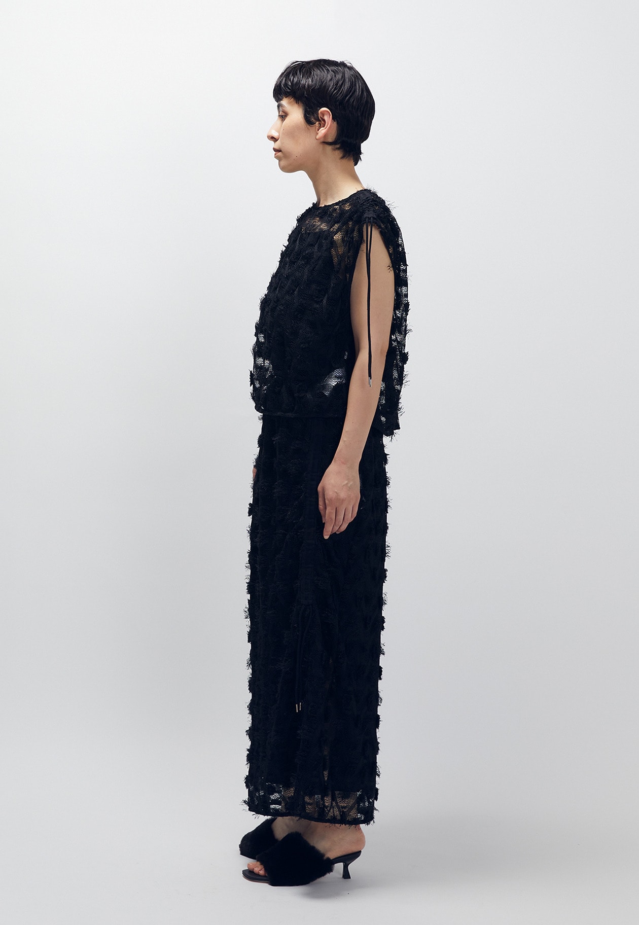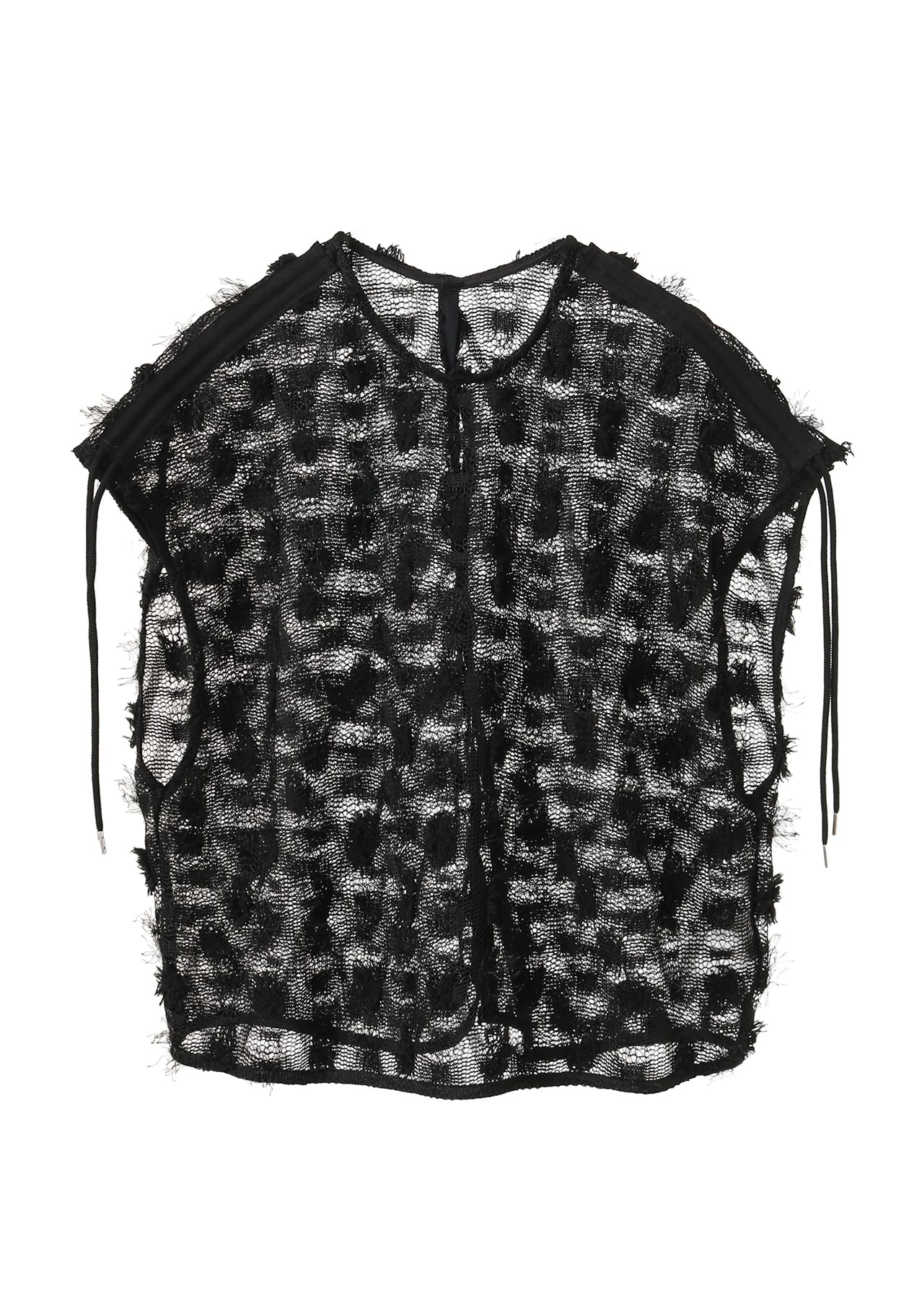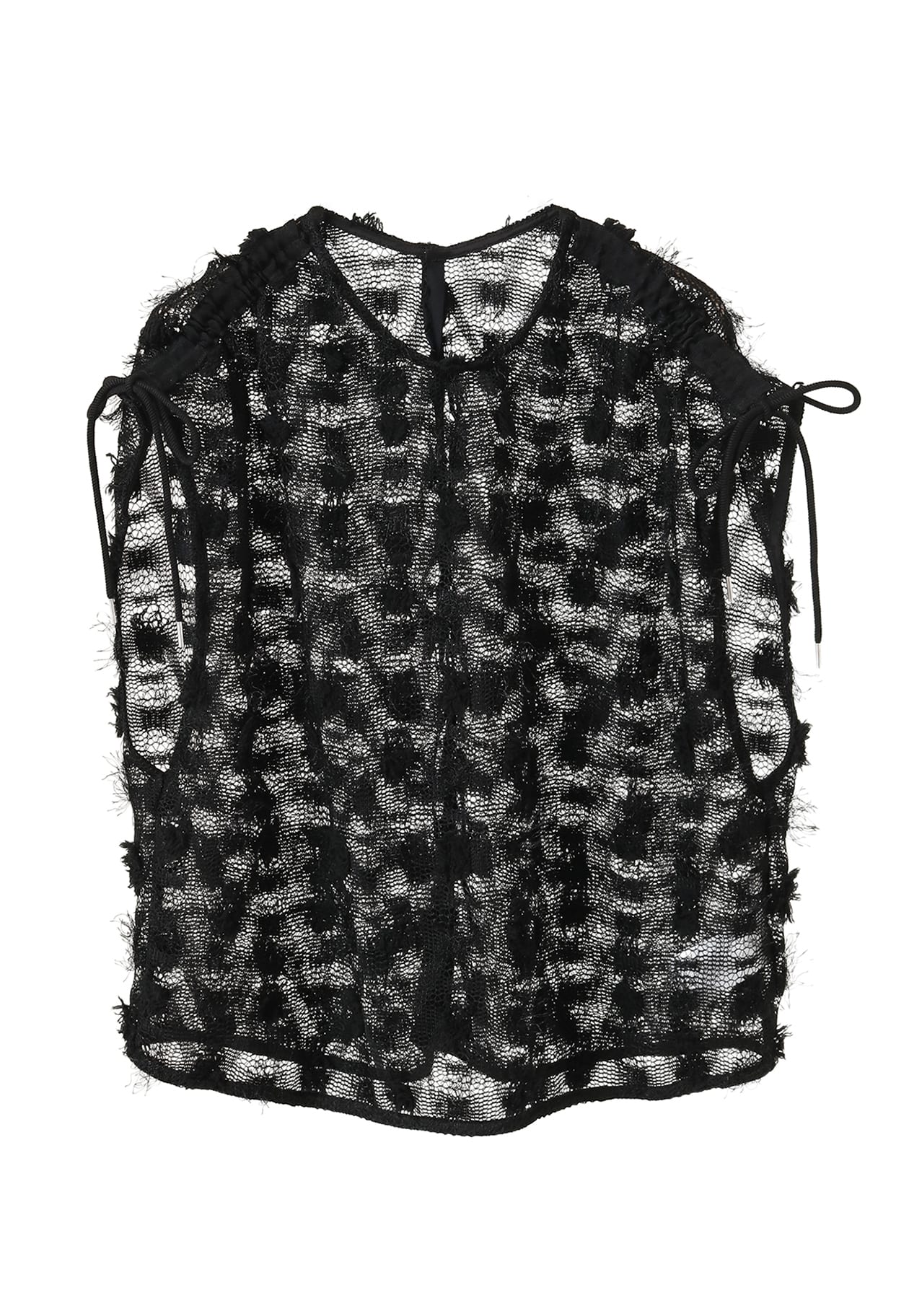 肩のドロストを引くと、リラックス感のあるフレンチスリーブのトップスが、スリーブレスギャザートップスに。