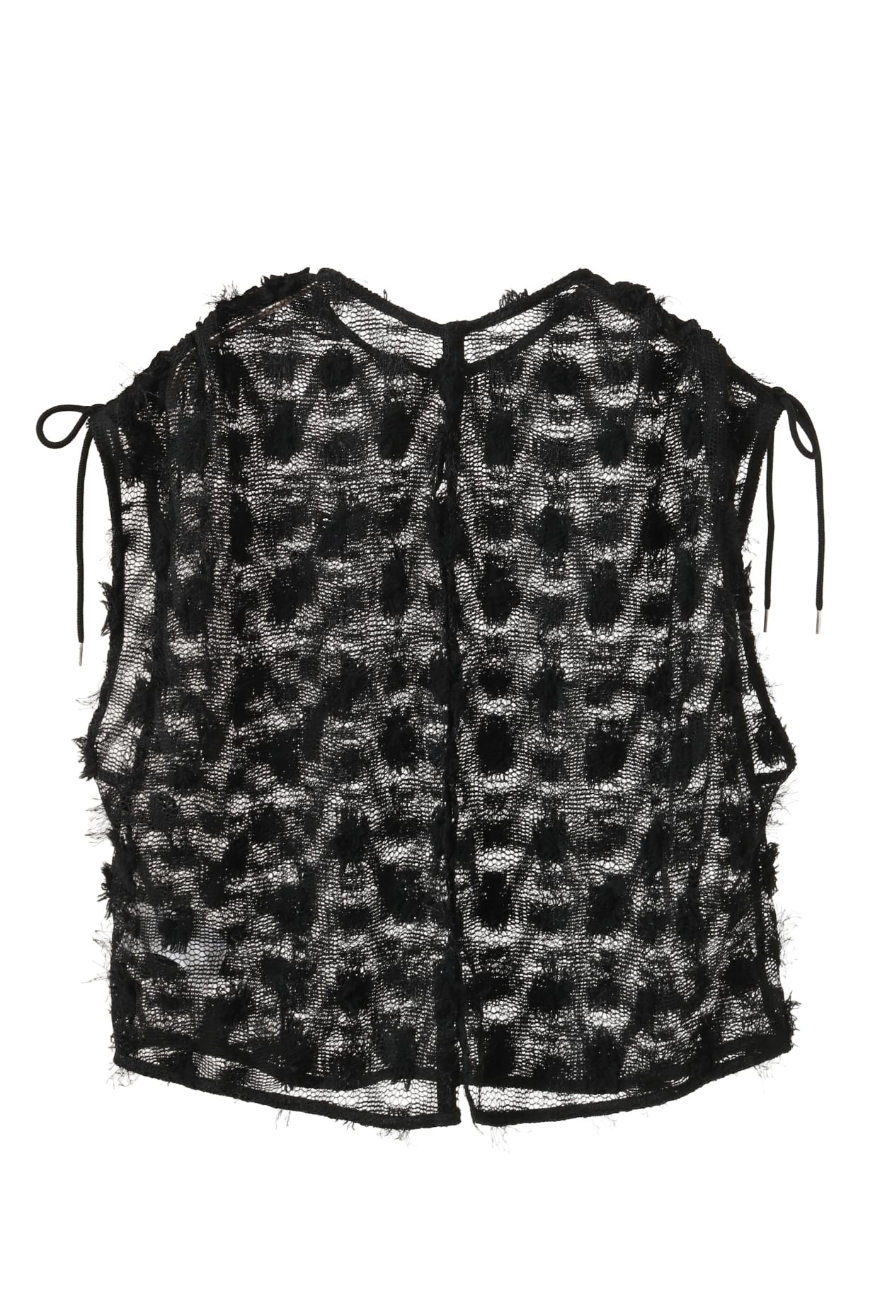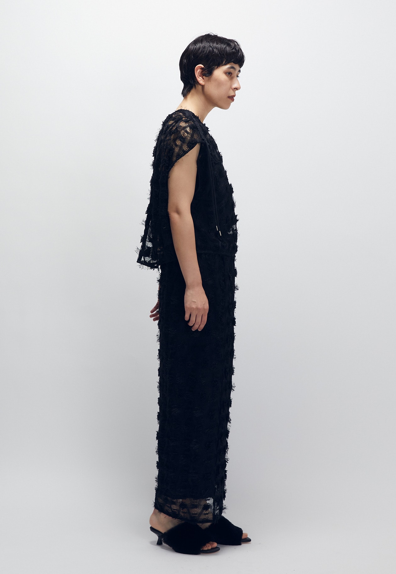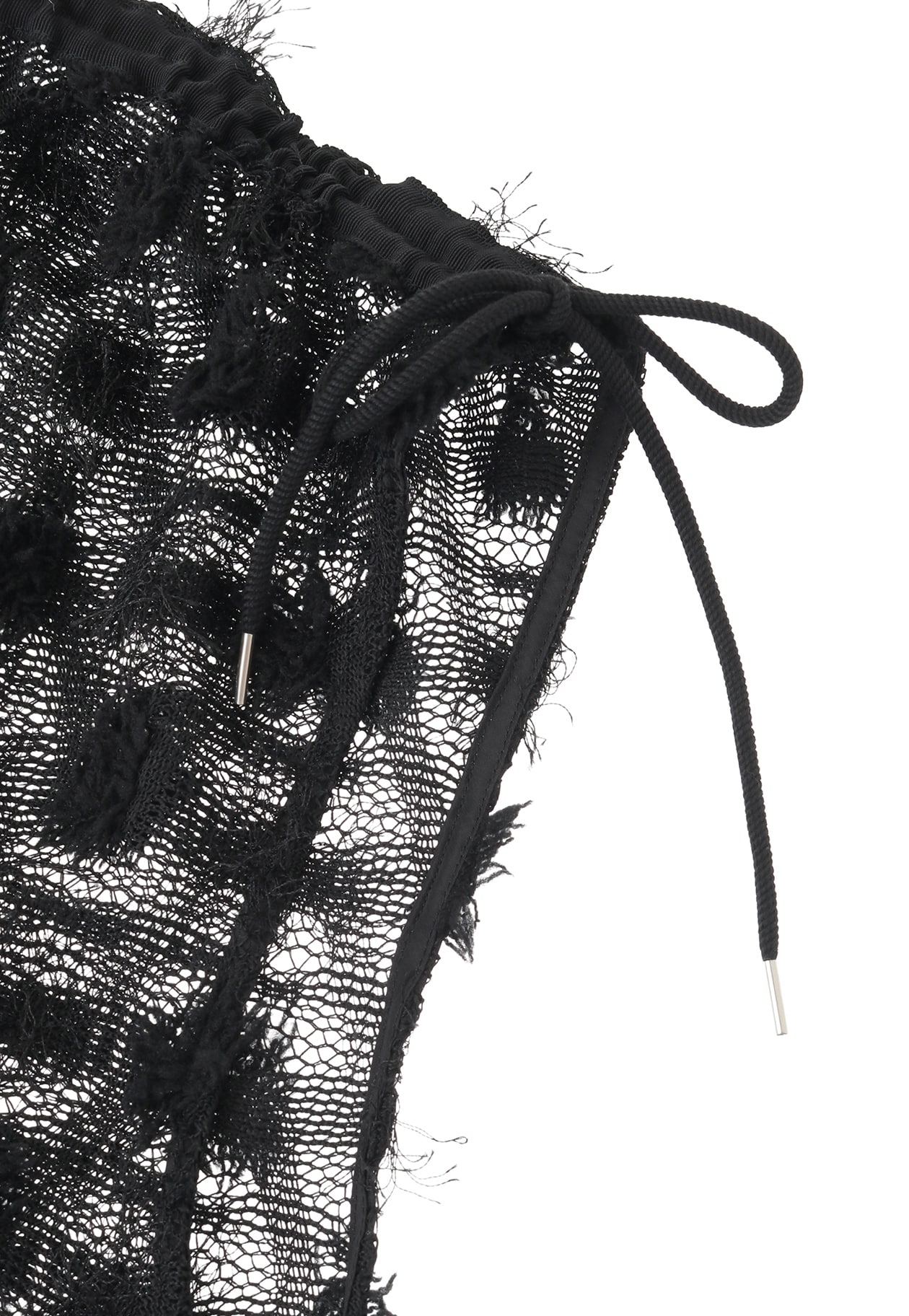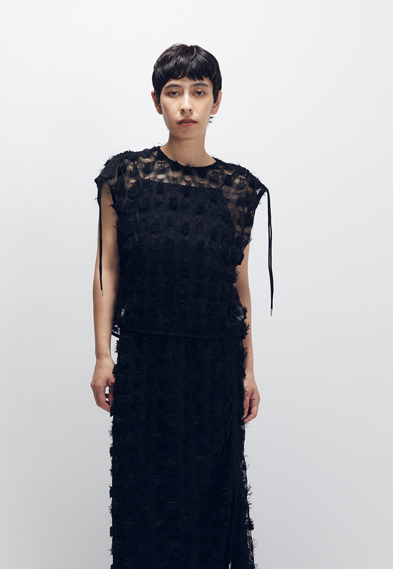 肩のドロストを引くと、リラックス感のあるフレンチスリーブのトップスが、スリーブレスギャザートップスに。