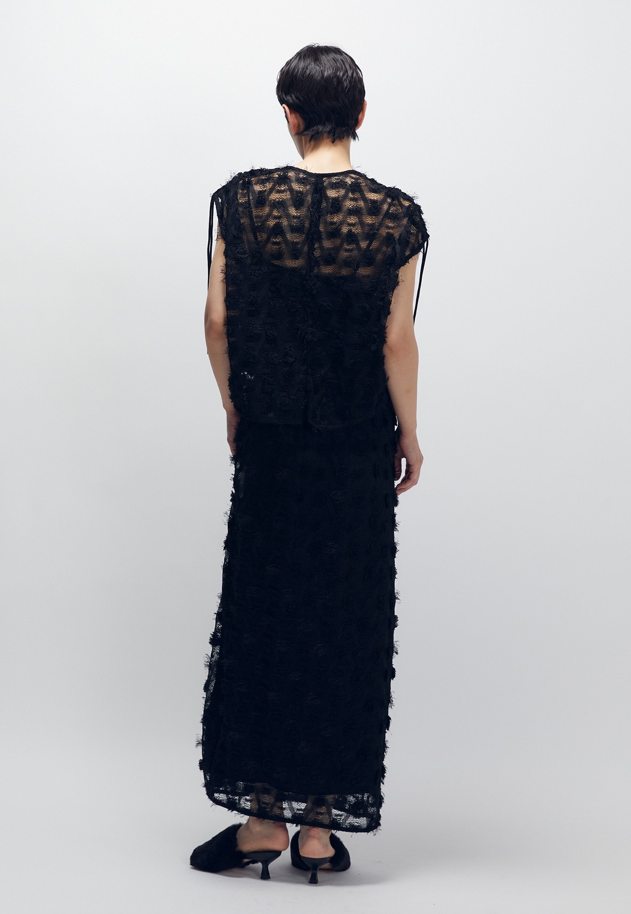 ラウンドネックなので、フリルカラーなどのデザインシャツとあわせると、衿元が華やかに。
